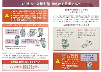 血液をサラサラにする薬、エリキュースの説明冊子をもらっていたことに気づき、読んでみると副作用が出ることがあると書かれている。下記冊子のコピーの右下に記載がある。